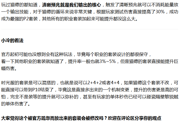 套装给我们提供的是可以在任意形态下释放愈合,而猛兽攻击天赋提供的是自然法术变为顺发,那么我们就可以一直在变形形态下释放愈合来触发前面的清晰预兆,根据玩家测试,在团本中因为有骑士的回蓝审判和各种充电宝所以根本感觉不到缺蓝,但是如果是打木桩的话打两分钟就会缺蓝了,这个和兽王猎类似,打木桩很缺蓝,但是打团本根本不缺蓝!