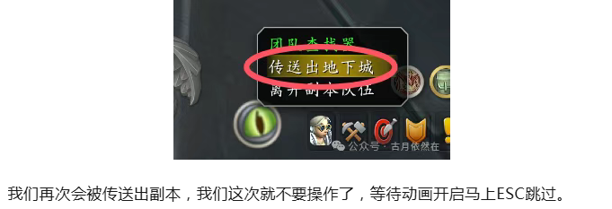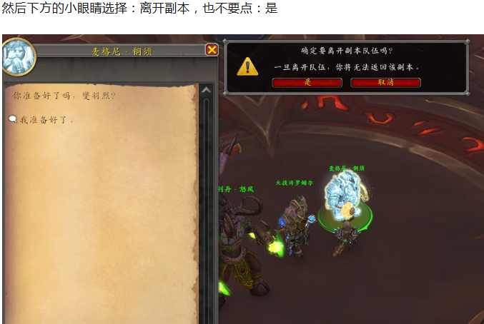 铜须又会跑过来啦,同样我们点开铜须对话框和离开副本的对话框。但是这次顺序不一样了!这次先点击【是】,但是这次我们不会被传出去。