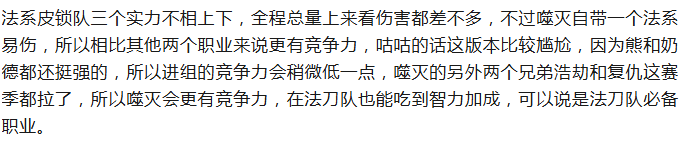目前根据各主播的测评结果和测试服玩家的综合测评来看,恶魔术、邪DK稳进国家队了,坦克还是酒仙最稳定,治疗就是奶德了,第五个位置要么是12.0版本强势的增辉要么是自带法系BUFF的噬灭或法师。