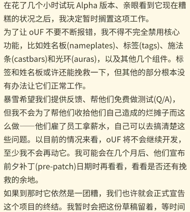 继WA宣布停更之后,UI界面也正式停更了,对于这个信息很多玩家表示不能接受,因为WA停更之后会有暴雪内置的wa代替,实在不行可以不用,但是ui界面如果停更,那么到时候画风可能就会倒退几年,一直看习惯的界面突然就没了,感觉都不是同一个游戏了。关于这个问题,不到一天的时间就冲上了论坛热帖榜。