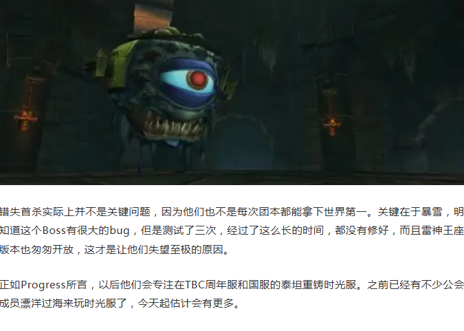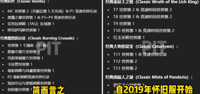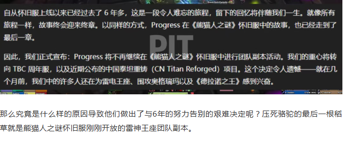 今天看了pit发布的视频,真的是让人觉得有点唏嘘啊。曾经魔兽世界怀旧服拿下无数次全球首杀的第一强会Progress居然宣布解散了。而他们解散的原因更加让人感到无奈,就是因为暴雪目前在熊猫人之谜怀旧服上的摆烂状态。