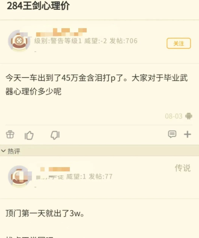 玩家随便找了一个团,结果自己想要的284王剑被顶到了45W,最后P了。对于这个情况还特意发了一贴问玩家,现在王剑的价格,对此网友给出的答复是3W。说3W可能会有点低,但是45W很显然不合理,因为一般来说超过10W就该考虑是否值得的问题了。
