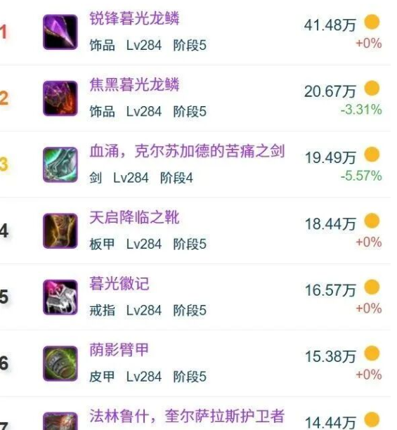 这应该就是HICC最坚挺的装备了吧,一直到现在均价还能保持在40万以上,第二名直接是20W,差了一倍。越是往后递减趋势越有规律,唯独284的龙鳞是断层的高于其他装备。不过现在这个时间购买的话,也只是能爽半个月左右时间了,因为后续30号更新一集时光服都即将来了。