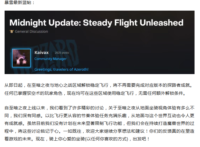 暴雪最新蓝帖:玩家可无条件解锁稳定飞行