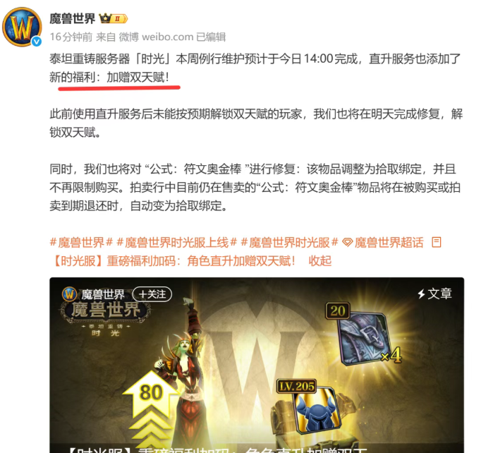 【魔兽世界】时光服直升重磅改动,直接加赠双天赋,开服时间确定!