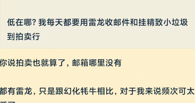 起因是有玩家提问绝版的雷龙到底什么时候返厂,之前因为玩怀旧服错过了,现在特别想要一只。但是底下的评论全都是与其花那么多金币或者RMB去购买,还不如拿一个牦牛更加划算,雷龙的使用频率还不如牦牛之类的话。不过只有用过的人才知道,雷龙有时候真的是很方便,尤其是制作业。