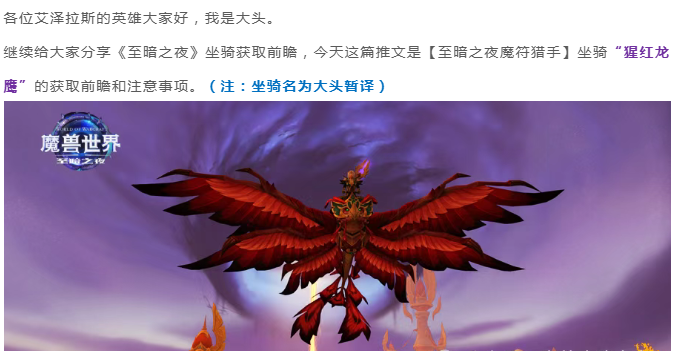 魔兽世界:至暗之夜坐骑“猩红龙鹰”获取前瞻,该坐骑获取难度低、静止时有羽毛飘落