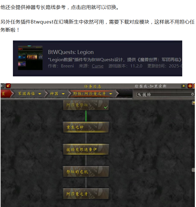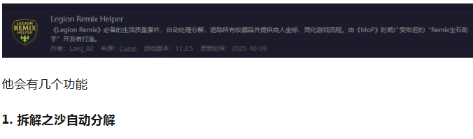 大家在体验军团再临幻境新生时,老的插件虽然兼容但是不一定好用,给大家推荐一个插件:Legion Remix Helper,目前大脚插件库已经加入了可以去下载。
