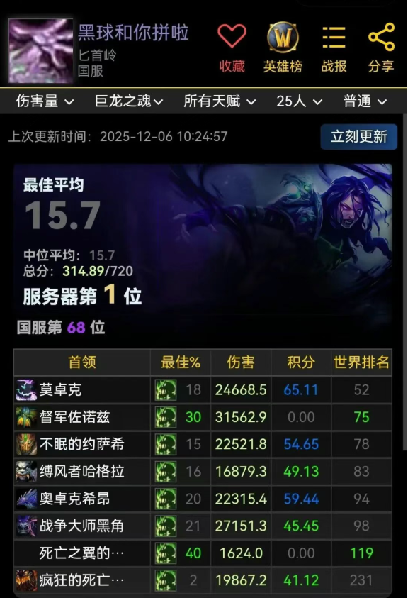 来自玩家的分享,魔兽世界“熊猫人之谜”一位15.7灰分的痛苦术士玩家居然拿下了服务器排名第一的宝座。这确实让人无法理解,究竟是如何实现的。