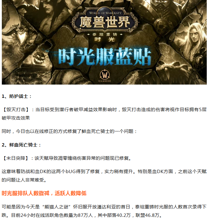 【魔兽蓝帖】两个职业再迎加强!时光服金价大跌!排队人数首次骤减