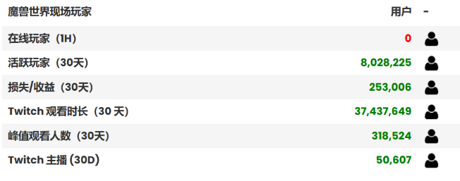最近30天内的魔兽世界活跃玩家数量为802万人,相比上个月增加了25万人。