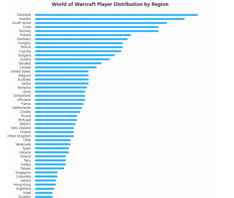 魔兽世界玩家在全球的分布情况让人意外,北欧国家的玩家非常喜欢玩魔兽世界,或许跟当地气候寒冷,户外活动较少有关系,紧随其后的是韩国玩家,而美国玩家并不是很多。当然这个数据也不包含国服,如果把国服纳入,我们才是全球魔兽世界玩家最多的地方。