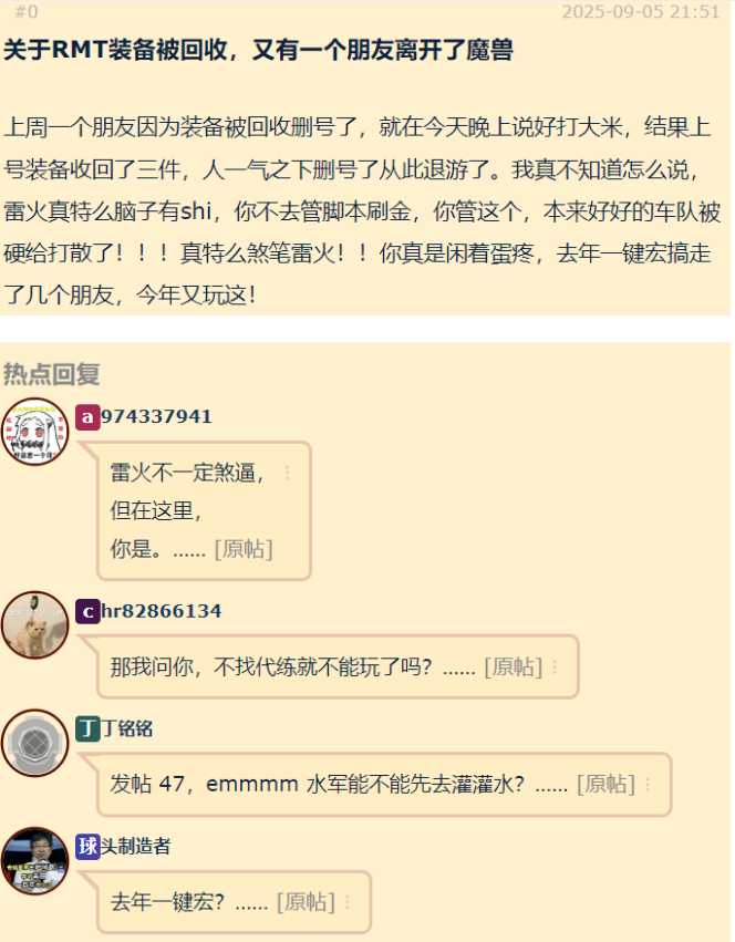 真是活久见,居然有魔兽世界玩家到NGA发帖,说自己朋友因为RMT装备被回收AFK了,之前还有朋友因为一键宏被搞走了,然后还骂雷火,真的是乐了。 还是网友的回复正常一些。