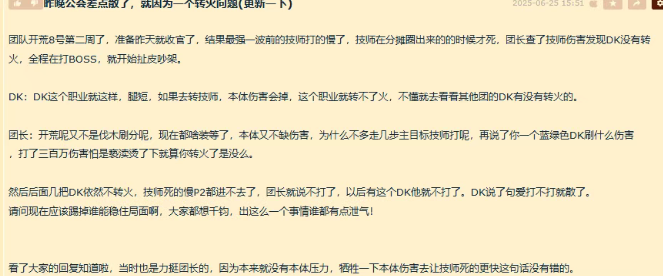 一个转火就可以把整个团都给搞解散,这就是近期论坛非常火的一个瓜。团长在复盘分析的时候发现了队里的DK没有转火一直打BOSS,于是在群里说了这件事,结果直接吵起来了,后面几把的时候DK依旧没有转火,团长就放狠话有这个DK就不打了,最后闹得不欢而散。