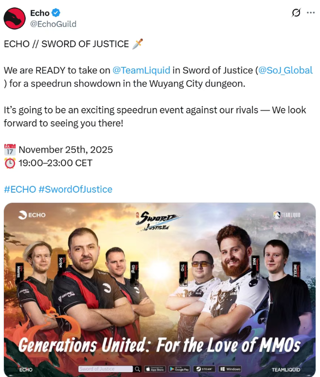 ECHO 官方宣布:将与老对手 Team Liquid 在逆水寒国际服赛事中,展开一场五阳城副本的 速通巅峰对决!