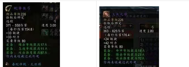 玩家发现P2瓦斯琪弓数值有问题,瓦斯琪的226速度3.0弓上限只比219速度2.9史诗弓高2点。随后对比了其他226远程武器,发现瓦斯琪弓实际数值是219装等,所以玩家觉得这个数值是不是暴雪填错了,随后又对比了魔改后的NAXX帕奇维克226速度是2.8弓,和老版5人阿尔法本的226速度也是2.8弓。不过现在的数值并不是暴雪正式公布的数值,具体的要等到正式公布,到时候看看是不是真的这样。