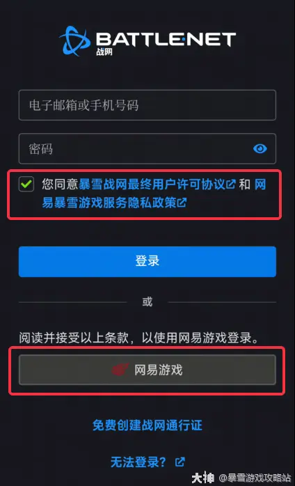 a、打开战网客户端时打开战网网页,阅读并勾选同意条款,点击网易游戏按钮。
