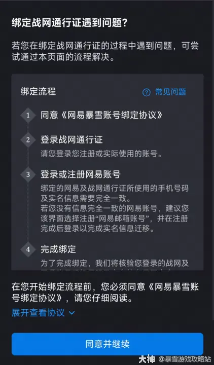 b、登录网易账号,还没有?点击此处去注册,请注意:新注册网易账号的绑定手机号码需要与待绑定战网通行证手机号码相同,新注册网易账号与待绑定战网通行证的实名信息需相同,阅读绑定协议同意并继续。