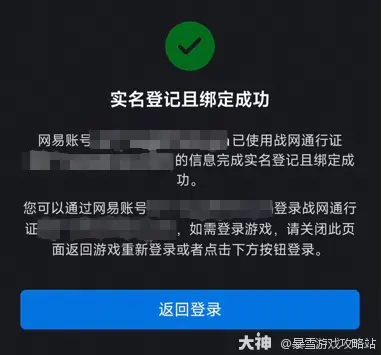 h、网易账号已使用战网通行证的信息完成实名登记且绑定成功,点击返回登录回到战网通行证登录页面,使用网易账号登录即可。