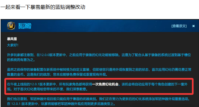 在12.0前夕上线后大家应该都一经发现自己的幻化没了,而且恢复之前的幻化还要花额外的金币才行,暴雪承认了这是自己的疏忽会在12.0.1版本更新后给所有玩家补偿一套免费的幻化!