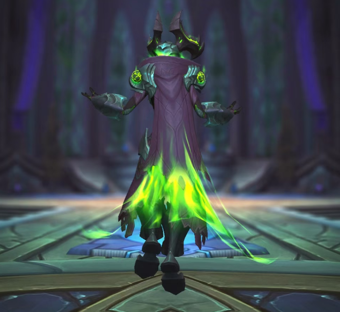 这套装备外观以暗绿色邪能能量为主调,肩甲散发符文流光,气场拉满,