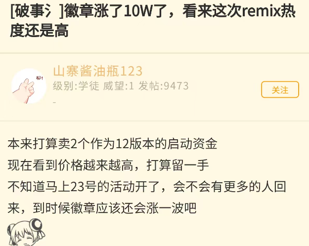 暴雪一个操作直接让徽章价格涨了10W金,现在已经突破了70W,之前还是60出头,原因就是开开放了军团再临版本,很多玩家正式服都戒断了,要不是有坐骑拿估计很多玩家这段时间都不会上正式服,因为大米也拿到了所谓的3000分门槛了。