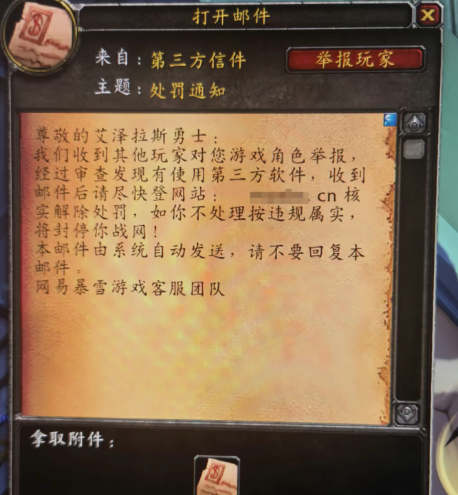 他表示这是一个诈骗邮件,我已经举报了。但是不知道会不会有人上当受骗,最近挺多收到的。希望大家在收到信件的时候,千万不要随意登录不明网站!官方邮件和密语都会有蓝色图案的暴雪标志。