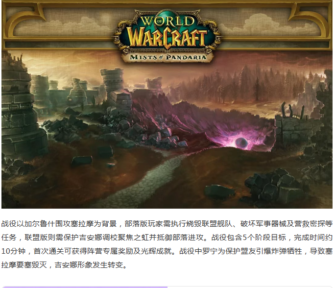 熊猫人之谜的剧情一开始是阵营对抗,暴雪在这里引入了限时事件——塞拉摩的沦陷。这也是魔兽世界历史上第一个场景战役。