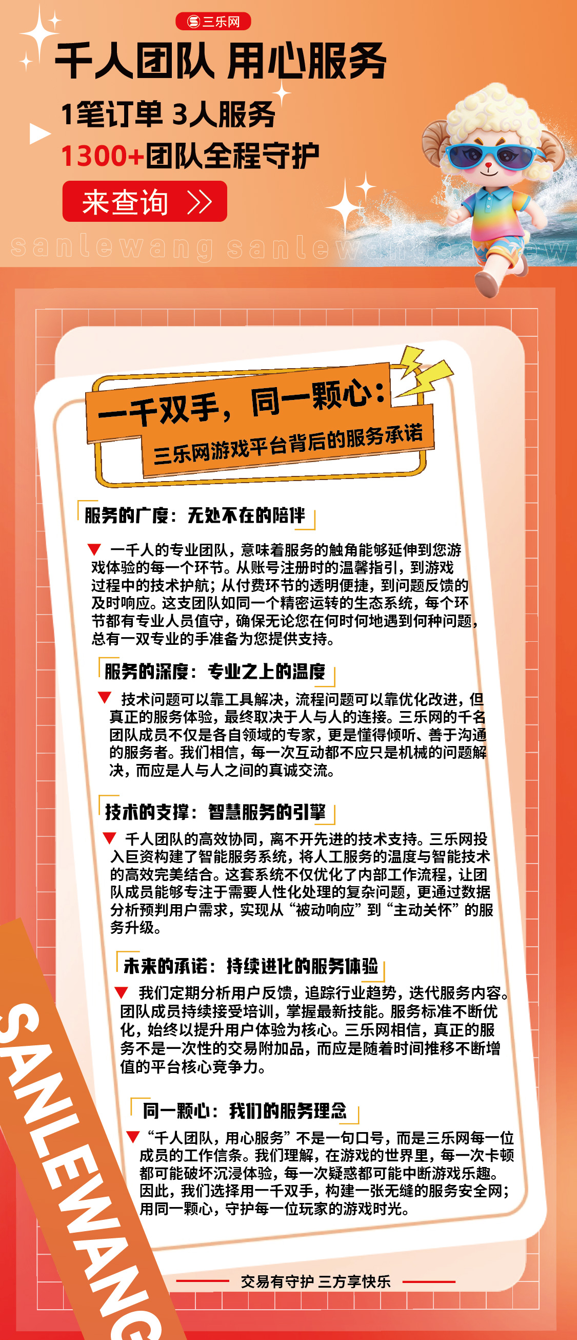 三乐网账号交易平台,千人团队,用心服务,1笔订单 3人服务1300+团队全程守护