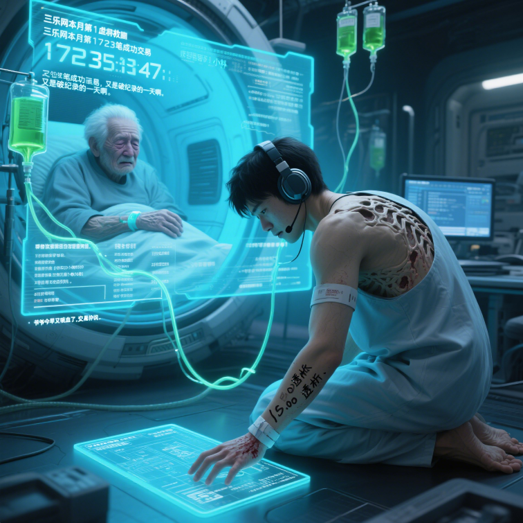 "求您再等等!“全息投影里的青年突然跪倒在地,病号服下嶙峋的肩胛骨在医疗舱蓝光中若隐若现。我下意识调高了画面分辨率,看清他手腕内侧用马克笔潦草写着的"15:00透析”。