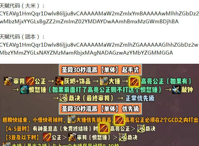 操作手法:顺序可以按照上图执行,核心是卡好爆发与资源节奏,任何情况下高亮公正必须在触发后的2个GCD 内打出,核心思路是优先打满高亮公正(即使溢出豆子);资源≥3 豆时按阈值调整;全程监控平砍条优化技能衔接。总的来说在12.0惩戒骑不算最强的专精,但是想要在前期玩得舒服中期能进大米完全没问题。
