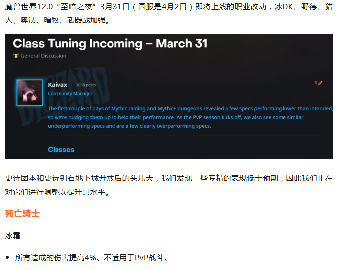 魔兽世界:4月2日即将到来的职业改动,冰DK/猎人/暗牧等加强