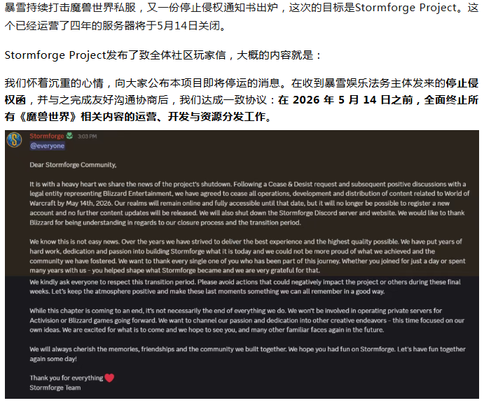 暴雪再胜一场!另一个私服宣告停服,已运营4年。