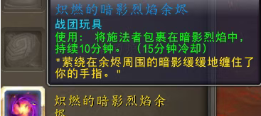 给大家分享一个可以让角色被暗影烈焰环绕的玩具:炽暗的暗影烈焰余烬,持续效果10分钟,CD只需要15分钟非常拉风。