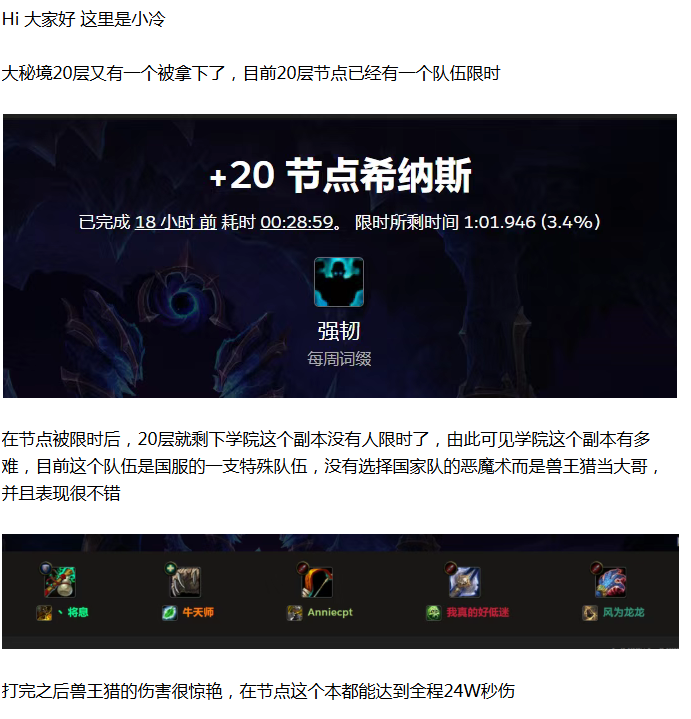 【魔兽世界】正式服20层节点首限!兽王猎全程23W秒伤带飞,国家队天赋分享