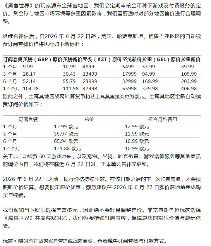 魔兽:暴雪宣布上调部分服务器的月卡价格!最高涨幅达37%!