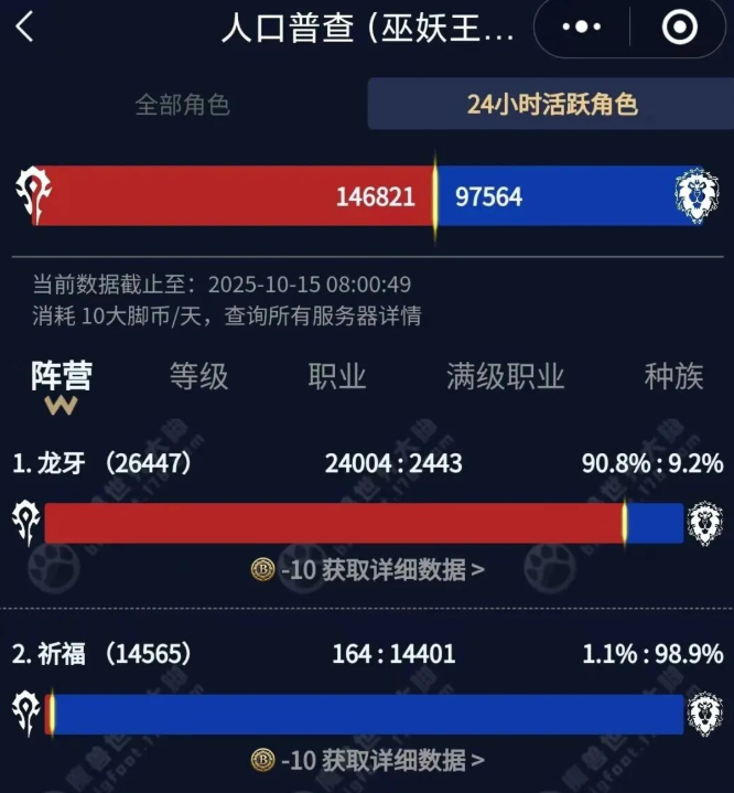 一觉醒来,巫妖王的活跃角色迎来了历史新低,根据第三方网站统计现在的活跃角色已经不足25W了,只有24W多一点,考虑到还有半个多月就开时光服了,到时候活跃角色可能会突破到10W,因为那个时候还在坚持的除了真爱玩家就是上来看一下的玩家了。