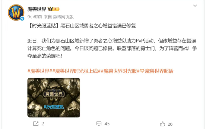 魔兽世界泰坦重铸时光服修复了一个黑石山区域【勇者之心】增益的BUG。
