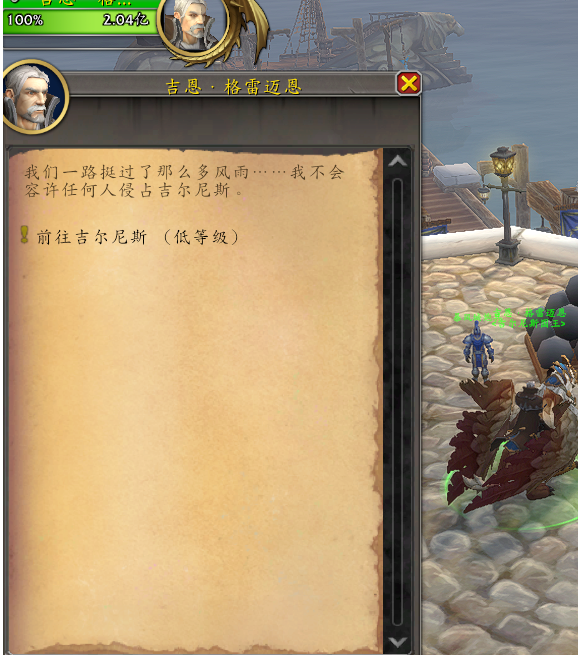 首先我们使用联盟角色来到暴风城35.28这里,找到NPC吉恩格雷迈恩接到任务:前往吉尔尼斯