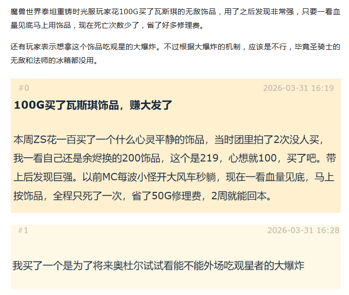 魔兽时光服:玩家花100金买了瓦斯琪饰品,表示赚大发了!