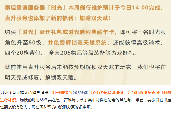 魔兽世界国服发布最新公告,泰坦重铸时光服的系统维护时间将延长到14:00。并且目前叮号福利再加码,直接送双天赋了。