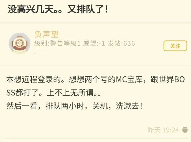 时光服这几天排队的人数又暴涨了,特别是时光2和3,只要小退一下重新登陆就会进入排队时间,而且这个时间还特别长,动不动就是几十分钟。前面几天还不会这样,因为前几天熊猫人开服分流了一部分,现在这部分又回来了。