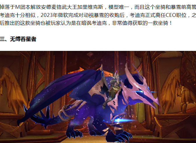 掉落于法力熔炉尾王迪门修斯,模型不是唯一,但是换色非常好看,自身有星光特效环绕,坐骑的配色为星空,皮肤上还有星系的图案,辨识度非常高,也是一款非常值得获取的坐骑~
