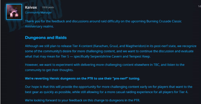 在前段时间,暴雪曾发布蓝帖,称魔兽世界TBC怀旧服周年纪念服的副本和团本难度将直接采用削弱版本。这一决定引发了大量外服玩家的不满,于是暴雪再次发布蓝帖,对副本难度做出改动。