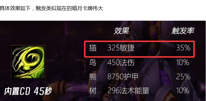 其他几系德鲁伊用这个饰品就一般了,鸟德的勉强可以用,熊和奶德基本不会考虑这个饰品,但是热爱野外PVP的德鲁伊玩家应该会很喜欢这个饰品,毕竟移速和耐力都是野外PVP很重要的属性。
