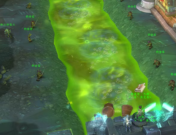 任务要求我们在这里钓金鱼,我们先找到任务提示的NPC对话后,就可以在这里绿色水沟钓鱼了,最好在鱼点里钓。钓上来的金鱼还可以在NPC这里兑换鱼漂。
