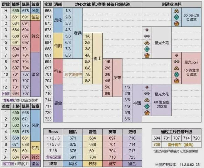 从表中可以看出,新版本所有内容的装备掉落规则均和之前赛季基本相同。比如大米仍然是7层掉鎏金,地下堡也依旧是11层掉鎏金。