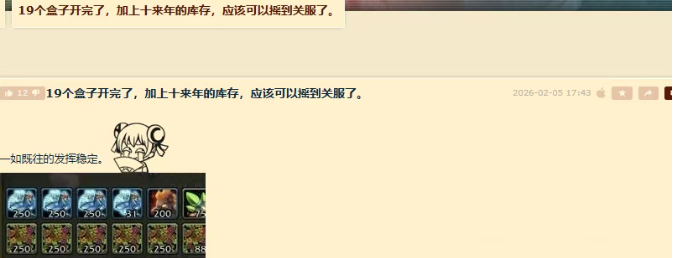 19个盒子一口气开完,加上10年来的库存,去年的还没摇完今年又可以继续摇了,只能说越摇越多越摇越有。但是一般的玩家都是直接摧毁了,只有喜欢留的玩家才会一直开。