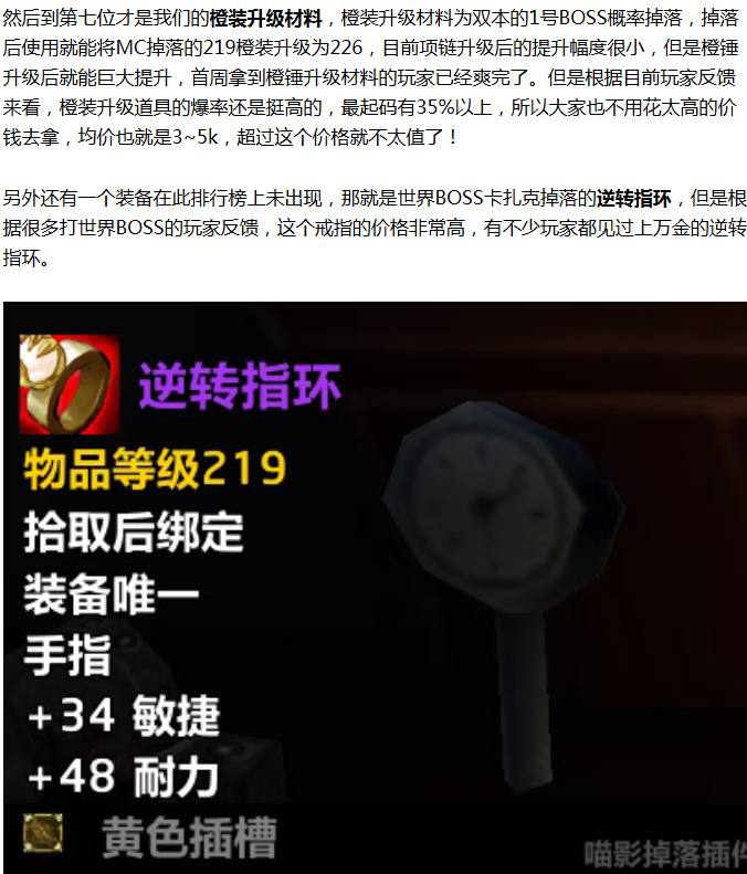 这个戒指是武器战、增强萨、猫德、猎人等热门物理职业的毕业戒指,P2没有能替换的,是新双世界boss最好的掉落物品,而且因为现在这个世界boss特别难打,所以价格也就水涨船高。