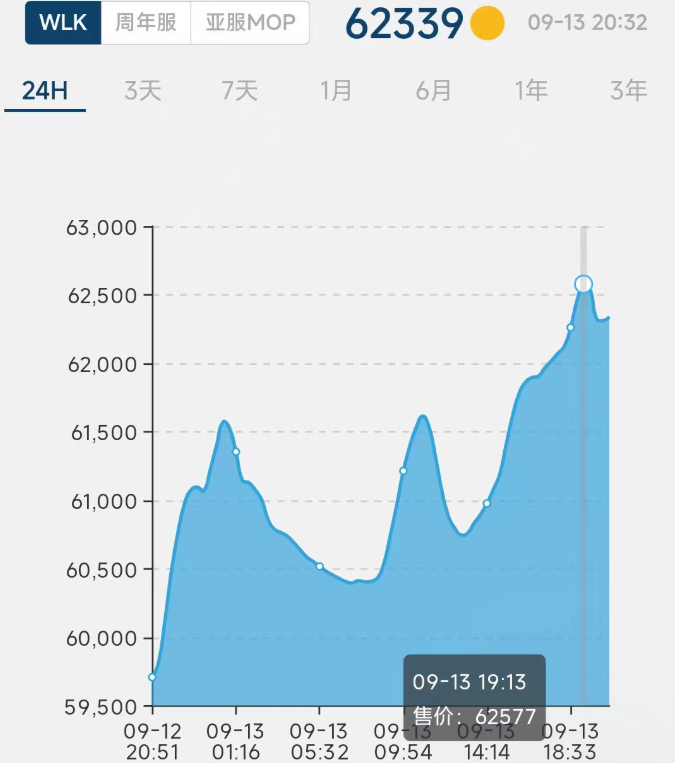魔兽世界“巫妖王之怒”怀旧服时光徽章在消停了几天之后,今天开始又涨了,目前已经突破了6.2万金币,创下历史新高。
